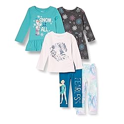 FABRIC: Tops are cut from our soft and naturally breathable lightweight cotton jersey. Leggings are cut from compact cotton-stretch jersey suitable for a snugger fit. OUTFIT ESSENTIALS: A mini capsule wardrobe for your child, these sets feature core silhouettes in coordinating prints and colors with mix and match styling details. DETAILS: Packs feature short-sleeve top, dress, and tunic with coordinating full-length leggings. The dress has an elasticated waist with decorative bow detail and pockets, the tunic features a ruffle flounce at hem. OFFICIAL LICENSED PRODUCT: Amazon Essentials offers one-of-a-kind products featuring your favorite characters to add wonder to your wardrobe! All products are officially licensed and designed in-house.