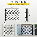 【DURABLE SECURITY GATE】- This metal security gate is built by heavy-duty 3/4" 14 gauge channel steel with a black powder finish to enhance durability. Its exclusive non-interference design guards your properties safely and effectively prevents unexpected intrusions. 【SINGLE FOLDING DOOR】- The single folding gate has a retractable door width structure with a height of 52". Retracted Collapsed width: 4". Expanded width: 85". The standard size is suitable for use as safety doors, barricade gates seeking protection, and defend. 【FLEXIBLE ROLLING CASTER】- Designed with rolling casters in the bottom to swing up to 360 degrees and with lock designs to fix the position. The side-folding door can stay in an unobstructed clear-opening state or complete closed condition. Such a smoothing rolling security gate brings you convenient transport and storage. 【EASY LOCK & INSTALLATION】- The fence security gate has a padlock hasp for locking, and the door kit comes with a separate padlock with keys to using accordingly with the hasp. A set of mounting tools is included to provide a breeze installation and hassle-free use for you. 【WIDE RANGE APPLICATION】- It is widely used at home and industrial places to close or lock off an area while maintaining its visibility and allowing unobstructed air circulation, adding security for the basement, garage, storefront, etc.