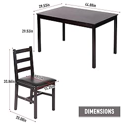 - Enhance your dining space with this 5-piece solid wood dining table set—designed for both function and style in compact settings. Crafted from durable solid wood, this set offers a sturdy structure and a smooth surface that’s built to withstand everyday use while maintaining an elegant appearance. Perfectly suited for kitchens, apartments, dining nooks, or commercial spaces like cafés and bistros, the set includes a table and two upholstered chairs. The padded seats and supportive high backs provide ergonomic comfort, making every meal more enjoyable whether you’re dining solo or hosting a guest. The space-saving design allows the chairs to slide neatly under the table when not in use, keeping your space organized and tidy. Easy-to-follow instructions and included hardware make assembly simple, while the smooth tabletop surface ensures easy cleaning and low-maintenance upkeep. Combining practicality, comfort, and timeless charm, this dining table set is a versatile addition to any small living or dining area.