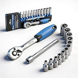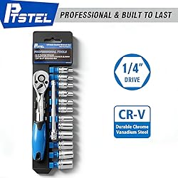 Professional Socket Set: 1/4” mini socket wrench set includes 12pcs socket: 4, 4.5, 5, 5.5, 6, 7, 8, 9, 10, 11, 12, 13mm, one 72T ratcheting handle, and one extension bar is increased the length of hard-to-reach fasteners and access to narrow spaces. Widely Used: 14 pieces 1/4'' travel socket set include universal basic tools extend beyond the auto shop, it is idea for home repair, Garage Workshop, Metal/Woodworkers, DIY designer etc. Durability: The metric socket set is made of heavy-duty drop-forged chrome-vanadium steel to withstand extreme torque changes in fasteners, which is mirror chrome plated finish provides high hardness and rust resistant. Reversible Ratchet: This 72 teeth ratcheting wrench designed a push button ball bearing quick -release mechanism for easy socket changing, the reverse the switch that improves efficiency and performance. Portability: All of socket organized on plastic storage rack, you can hang on the tool wall when you are not using it.The plastic holder is convenience for you to bring and storage.