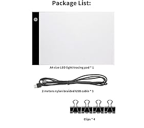 - Portable A4 Tracing LED Board Light Box, Ultra-Thin Dimmable USB Cable Powered Artcraft Trace Light Pad Copy Boxes for Artists Tattoo Drawing, Sketching Tracer, Animation, X-ray ?A must-do firstly-please peel off the protection film and put a paper on the lighted pad, you will see it works great. Advantage: designed for portable: ? 1?-the working area is A4 paper size, the whole pad size is 138.5 inches. 2?- It is super thin: thickness is about 0.16 inches 3?-it is lightweight: about 300g 4?-Strong, tough, Crystal Acrylic pad is used so you don't worry about bending, dropping, water spraying. 5?-a very long (2meters) nylon braided USB cable included, so you don't worry the breaking and twisting of the cable. technical advantage: 1?-light-Touch sensible Switch: long press for stepless brightness adjustment. short press for on/off 2?- Memory Feature - it can memory the last settings of the brightness so you won't have to re-set again when you turn on the pad each time. (others' light pads may not have this future) 3?-flicker-free design: with strict current filtering and stabilizing, so it is much-improved eye-sore effect after long working. 4?-USB 5V power compatible: it is compatible with almost all the 5V USB standard socket, such as cellphone adaptor, power bank, computer or laptop USB port, etc. Package included: ? ( 1 A4 Light Pad + 4 Clips+ 1 nylon braided USB cable)