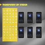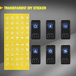 Feature: SPST 5 PIN ON OFF rocker toggle switch (Single Pole Single Throw) with 12V - 24V BLUE LED Light. IP66 Waterproof Rocker Switch with 20A 12VDC Rating. The 12V Rocker Switch with dual LEDs, the lower light is constantly illuminated when the switch is connected to the battery(clearly see the switch in the dark). Both lights are illuminated when the switch Powered ON. The Boat Marine Rocker Switch with 1.46 * 0.83 Inch Panel Mounting Hole Size, It's sturdy and durable and easy to install or replace. Application: The LED lighted Rocker switch fit for most Auto, Car, Truck, Jeep, RV, RZR, ATV, SUV, UTV, 4X4, Bus, Tailer, Wrangler, Marine, Boat, Yacht, Vehicles and etc. Available to control led light bar, led work lights, fog lamps, headlights, taillights and auxiliary lamps, etc. Package Included: 8pcs Rocker Switches, 8 sets of Jumper Wires, and 2pcs of DIY Sticker Labels.