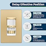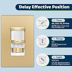 Sensor wall switch detects motion to automatically turn lights ON and OFF based on the movement detected in a room Passive Infrared (PIR) sensor detects motion with 180° field of view; advanced PIR reduces false triggers from unwanted movements; adjustable sensor range includes 25%, 50%, 75%, and 100% options Motion sensor wall switch features a universal wiring design with interchangeable hot and load wires to make installation easier; no longer second guess which wire goes where Turn lights ON, OFF, or let the motion sensor take control with AUTO mode; adjustable time delay options: 15 sec (Test), 5 min, 10 min, 20 min, 30 min; change mode with the OCC/VAC switch located under the face of the device Gold color; 1200 square feet max coverage area, 180-degree field of view; no neutral wire required; operable without a ground wire connection; 1.25A, 120VAC @ 60 Hz; 150W LED/CFL, dimmable light bulbs only; operating temperature 32-131ºF; compliant with Title 20 & Title 24; single-pole only; device dimensions: 2.5" W x 4.5" H x 2.5" D; UL listed