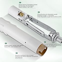 Ceramic Body.The bulb light E-12 sockets are ceramic.It has higher heat resistant rate up to 200deg,work with both LED and incandescent candelabra bulbs 4 Complete Bulb Light Holder Kits come with length adjustable candelabra sockets,cardboard insulator covers and white plastic candle cover sleeves.Perfect solution for your chandelier socket project UL Listed.Quality components are applied to every part of the structure. The bracket is adjustable in height to match different applications.The total height ranges from 3.8inch to 5.16 inch Application- Great replacemet for fixing broken socket fixture on chandelier,rebuilt a chandelier,fix window Christmas Electric Candles,restore old candelabra,re-wire an old sconce light etc Electric Rating up to 125V/75W.Bottom socket threaded 1/8IP which fit standard 3/8" lamp pipe or nipple.The white sleeve cover is 4" long,and the external diameter is @ 7/8"(2.2cm), internal diameter is @ 13/16"(2.06cm).