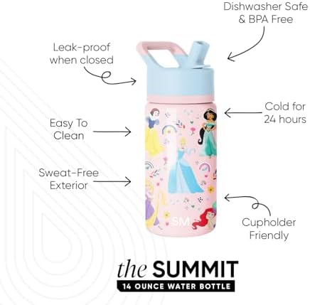 Botella de agua Simple Modern Kids Summit con tapa de pajita | Taza de acero inoxidable aislada de 14oz con princesa Disney | Arcoíris de princesas
