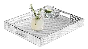 Great tray for serving your favorite foods and beverages atop your ottoman or coffee table; Boasts an ample serving area with high sides and cutout handles; Ribbed base is an attractive accent that inhibits items from sliding around. Simple and fashion design, hole handles of serving tray for easy carrying. Storage tray holder is perfect for home storage organizer, parties and entertaining. Tray care is simple, just easily wipe clean with damp cloth to restore the bright, air dry. Made of fashion silver faux leather, mdf, velvet, ottoman tray dimension: 16.2 x 12.2 x 2 inches.