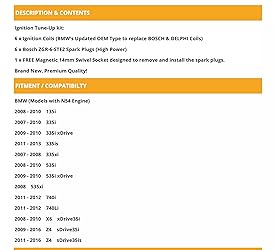 Original Brands: ELDOR / BOSCH 6 x Ignition Coils (BMW's Updated Version) 6 x Bosch ZGR-6-STE2 Spark Plugs (High Power) 1 x FREE Magnetic 14mm Swivel Socket designed to remove and install the spark plugs.