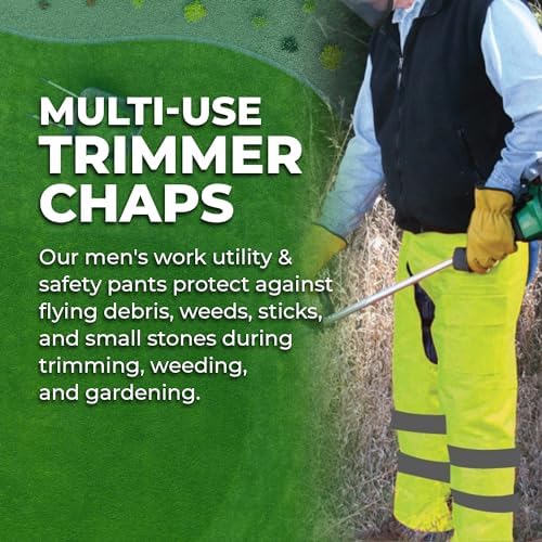 - MULTI-USE SAFETY PANTS FOR MEN - Protect yourself when landscaping with our trimmer chaps for men. Designed to be worn when brush cutting, line trimming and when using lawn care equipment and tree cutting equipment. These versatile apron-style pants feature an adjustable belt and a built-in pocket for holding small tools and accessories.