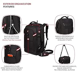 HYBRID BACKPACK/LUGGAGE CONSTRUCTION: Large main compartment that expands to add 20% more carrying capacity. Includes bonus removable laundry/shoe bag, packing cube, and electronic accessories carrier. This bag also features tuck-away shoulder straps, as well as padded top and side handles that allow for the backpack to be converted to a traditional suitcase. ORGANIZATION: The large capacity main compartment features three internal zippered accessory pockets. The padded laptop compartment is designed to carry most 15" portable computers. In the front, there is a quick access pocket with built-in RFID and an additional fleece-lined pocket designed for large glasses. In addition,this versatile pack includes a side water bottle pocket and zippered accessory pocket. COMFORTAND QUALITY: Ergonomically contoured, padded shoulder straps with adjustable sternum strap for maximum support and wearing comfort. CHARGE DEVICES ON THE GO: An integrated USB port allows you to charge your smartphone, tablet, and laptop wherever you are. (battery pack NOT INCLUDED) DIMENSIONS: Exterior — 21.5" x 13" x 8.5"; Laptop Compartment — 14.75" x 11" x 1.5"; Bag volume — 48 L