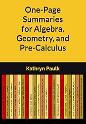 - This book contains a set of one-page summaries and problem examples for important math topics covered in Algebra, Geometry, and Pre-Calculus. Current students may use the summaries and examples to reinforce material learned in class. The concentrated, one-page math summaries give students an excellent overview of the material and may provide new insights. Students planning to take SAT exams or higher-level math courses may use the summaries for review and reference. Summaries and examples for the following topics are included: Lines – Perimeter, Pythagorean TheoremArea – Rectangles, Triangles, Circles, OvalsVolume – Cylinder, Pyramid, SphereRegular Polygons – Angles, Sides, AreaTwo Points – Distance, Midpoint, Eqn. of a LineLinear Eqns. – Slope Intercept, Point Slope, & Std. FormQuadratic Eqns. – Standard, Vertex, & Factored FormGeometry Circles – Angles, Chord, Tangent LinesUnit Circle – Degrees, RadiansTriangles – Law of Sines, Law of CosinesExponents – RulesFactoring – Squares, Cubes, Binomial ExpansionExponential Functions – Decay and GrowthLogarithms -- Product, Quotient, & Power PropertiesParent Functions -- Graphs of 12 standard functionsTranslations -- Vertical and HorizontalGraphing Polynomials -- Zeros, Mult., End BehaviorGraphing Rational Functions – Asymptotes, HolesConic Sections – Parabola, Ellipse, HyperbolaSeries – Arithmetic and GeometricBasic Statistics – Mean, Median, Mode, Std. Dev.Vectors – Dot Product, Cross ProductComplex Numbers -- Rectangular & Polar FormPolar Curves -- Circle, Spiral, Rose, LimaconSymbolic Logic – Boolean AlgebraPolynomial Division – Long and Synthetic The first edition (yellow cover) has all summaries grouped together in Part 1 and all examples grouped together in Part 2. The second edition (blue cover) has all summaries and examples grouped together for each math topic. Additionally, the second edition is formatted to provide a better eBook (Kindle) reading experience. ...
