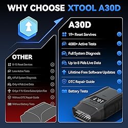 Save $500+/Year with Pro-Level Diagnostics -No Subscriptions: The Portable XTOOL Anyscan A30D OBD2 scanner diagnostic tool includes free lifetime software updates for all app service functions, without extra cost. With a single payment, enjoy full access to diagnostics, relearn scan tools, and maintenance features. A cost-effective, smart choice for car owners and DIY enthusiasts, compatible with vehicles from 1996 onward. Please provide the car VIN and the special functions you need in advance so that we can confirm compatibility Bi-Directional Control for Faster Troubleshooting: Unlike a basic code reader, the A30D bi directional scan tool sends commands directly to your vehicle’s ECU to actively test components like fuel pump, valves, wipers, windows, doors, sunroof, and headlamps right from your smartphone. See component responses in real time without disassembly—perfect for brake jobs, electrical issues, and hard-to-find problems. This bidirectional obd2 scanner helps pinpoint faults faster, reduce guesswork, and avoid replacing good parts. An efficient, easy-to-use car scanner diagnostic tool built for DIYers, home garage users, and small-shop technicians who want real two-way scanner, not just codes 19 Reset Functions for Routine Maintenance: The A30D car diagnostic scanner provides 19 relearn functions without extra charges, including EPB Reset for parking brake replacement, TPMS Reset after tire changes, ABS Auto Bleeding, Oil Reset, SAS Reset, BMS Reset, Throttle Relearn, Injector C0ding, Gear Learning, Crank/Crankshaft/Cam/Ckp Sensor Relearn Tool, Transmission Match, Seat Calibration, Airbag Repair and more. This XTOOL A30D automotive scanner diagnostic tool supports preventive care, helping extend vehicle life and reduce costly shop visits. Functions vary by vehicle make and year—plz confirm compatibility before purchase Stable BT Connection & All-System & 8 Pids Live Data: The A30D wireless OBD2 scanner delivers a fast and stable wireless connection up to 33 feet, letting you move freely around the vehicle without tangled cables. Pair with with Android 9.0+ and iOS 10.0+ devices to turn your phone into a mobile auto scanner—perfect for home garages, driveways, or on-the-spot repairs. This full system scanner for cars provides real-time access to all major modules, including Engine, Gearbox, ABS, SRS, AC and more. with clear graphs, meters, and up to 8 PIDs displayed at once. This car code reader makes system monitoring visual, simple, easy to understand, and offering data logging for playback and deeper Wide Compatibility with CAN-FD & FCA Support: The A30D car computer diagnostic reader works with most 1996 and newer vehicles with a standard OBD2 port, including for Ford, for GM, for Toyota, for Honda, for Nissan,for Hyundai etc, with ongoing updates covering more car models and functions later. It also supports newer communication protocols like CAN-FD and FCA AutoAuth (Personal AutoAuth account and active subscription required, not included with the device!for Chrysler, for Dodge, for Jeep, for Fiat models). It is a future-ready automotive scanner diagnostic tool for households with multiple vehicles or part-time techs. Coverage vary by cars, plz check the compatibility first Effortless Vehicle Health Monitoring at Your Fingertips: The A30D car scanner simplifies routine maintenance and performance tracking. With smart AutoVIN detection, it instantly identifies your vehicle without manual input. Real-time data including engine RPM, fuel trim, and system voltages—is displayed using graphs, meters, and up to 8 pids charts, making diagnostics visual and easy to follow. This car computer diagnostic reader is ideal for DIY users and small repair shops, offering data logging for playback and deeper analysis when needed Stable BT Connection & Compact Design: A30D scan tool ensures a fast and stable wireless connection up to 33 feet(the vehicle ignition is ON). Forget tangled cables—this compact vehicle code reader pairs with Android 9.0+ and iOS 10.0+ devices.The A30D requires the vehicle’s ignition to be in the ON position to function properly. If the vehicle is not powered, the device’s indicator light will not illuminate, make sure that the vehicle’s ignition is ON before connecting the device via BT Full-System Real-Time Data at a Glance: Unlike limited code reader, the A30D full system scanner for cars provides real-time access to all major vehicle systems. Real-time readings such as oil temperature, brake pressure, and gear status are displayed in clear graphs for quick analysis. This obd ii scanner diagnostic tool makes it easy to spot abnormalities. Whether you're scanning at home or in a shop, this auto diagnostic code scanner helps you make informed decisions with clarity and precision More Than Just a Check Engine Code Reader: While many diagnostic scan tool are limited to engine diagnostics, the A30D car diagnostic scanner all vehicle systems and provides in-depth diagnostic reports. It gives DIYers, techs, and enthusiasts a better understanding of their vehicles, helping avoid unnecessary repairs. Whether you're a technician, DIYer, or car enthusiast, this powerful automotive scan tool gives you a deeper understanding of your car's true condition, helping you fix issues accurately and avoid guesswork Backed by 13 Years of XTOOL Experience & 2-Year Repair: With over 13 years in obd2 code reader, XTOOL has built a reputation for dependable tools and consistent performance. The A30D automotive scanner diagnostic tool comes with a 2-year repair warr~anty and lifetime technical support. Whether you're new to diagnostics or a seasoned user, you’ll have a dependable code reader for cars and trucks and a support team that stands behind it. XTOOL helps you diagnose with confidence and keep vehicles in top shape