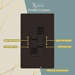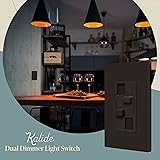 Dim LED lights to create the perfect ambiance with the Kalide dual load dimmer wall switch; supported by major-brand light bulbs from GE, Cree, Philips, Sylvania, Lithonia, Amazon Basics, EcoSmart, and more; not compatible with smart lighting fixtures Features two easy-to-use sliders for full-range dimming of two separate loads; to turn the lights OFF, move the slider all the way down until it clicks Allows for full-range dimming controls of two separate light loads from the same wall switch location; perfect for both residential and commercial locations such as offices, showrooms, family rooms, home theaters, and more! Made of Polycarbonate Thermoplastic material to provide the durability and resilience needed to withstand hard impacts and heavy force; heat & fade resistance to temperatures over 100° to prevent discoloration; flammability UL94; V2 rating Brown color; dual load; 200W LED/CFL; 300W incandescent/halogen; compatible with dimmable light bulbs only; single pole only; #14-#12 AWG (copper only); neutral wire not required; 1-year warranty; UL listed