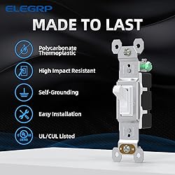 ✅【High Quality】 The toggles and frames are constructed from high-impact resistant thermoplastic and offer long service life. Smooth quiet toggle action. ✅【Self-Grounding】 Designed with a self-grounding clip for automatic connection in a properly grounded metal wall box. ✅【Quick Push-in Wiring】 Provide both quick push-in wiring and side wiring. Quick wiring push-in terminals accept #14AWG solid copper wire only. Side wiring terminal screws accept wire up to #12AWG copper or copper-clad wire. ✅【Easy Installation】 Break-off plaster ear for best flush alignment. Narrow slim body design leaves more room for wires in the standard junction box. ✅【Universal Application】 Suitable for residential use and most commercial areas that require only 15A switches. UL & CUL listed.