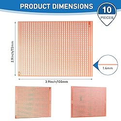 What you get: the package includes 10 pieces single protoboard side copper strip circuit boards, enough to meet your design demands such as electronic experiments and DIY projects Apply to: the PCB prototype blank boards can be applied for sodering and welding LED diode, IC, DIP, connector, resistor, sensor, transistor and other electronic power components or devices with 1 inch pin spacing Material and size: the base material is single-sided stripboard is quality copper, which makes it solid and sturdy; The PCB printed circuit board measures approx. 73 x 100 mm/ 2.9 x 3.94 inch, suitable for digital use Good plating: the PCB prototype perfboard kits are basic copper body, so as to prevent oxidation; Plated-through-holes ensure that the components will not fall off from the PCB under normal soldering conditions Easy soldering: the prototype boards are thick and single sided, and the plated holes are pre-coppered; The single-sided PCB prototype stripboard is very handy and easy to solder components and sensors