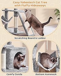 MORE THAN JUST A CAT TREE: The hallway, living room, or play room will be a perfect place for this cat tree. We have different colors for you to choose from. With easy-to-match color and an interesting layout, this cat tree will be a special decoration in your room QUALITY MATERIALS: The cat tower is constructed of CARB P2-compliant particleboard, plush, sisal ropes, paper tube, plastic, and iron. It is covered by comfy plush which aims to provide your cat with extra comfort. The whole structure is stable and strong enough for cat jumping and playing DOUBLE STABILITY: Safety and stability of the cat tree are important, especially when the cat is jumping and playing, therefore, we add an anti-toppling kit to the middle board. You can secure the cat stand to the wall for double safety THOUGHTFUL DESIGN: The hammock has four lengths of strings and four hooks in the corners, which is convenient for fitting on and removing. The dangling ball is detachable. Besides, all corners of the extended platform are round in shape, to avoid hurting INTERESTING LAYOUTS: Ample room and reasonable layout ensure your cat a comfortable and interesting experience. Your cute cat can hide in the condo, sleep on the lower hammock, and enjoy the scenery on the top perch. The scratching posts, a ladder, a hanging ball, and rope will bring him/her more fun