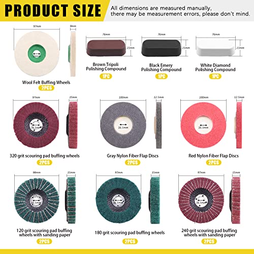 - 【Polishing Wheel Assorted Set】The buffering wheel contains 2 pcs wool felt buffer wheel, 4 pcs 120 &180 Grit green nylon fiber flap discs, 4 pcs 240 & 320 Grit red sanding flap disc, 2 pcs gray sanding abrasive wheel, 2 pcs red nylon fiber wheel, 1 pcs black emery, 1 pcs red rouge,1 pcs white Diamond, totally 17pcs. The full and complete polishing wheel kit for more choice, meeting your different polishing demands.