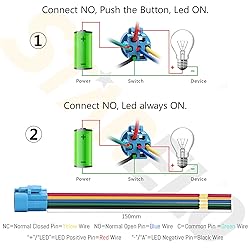 - Latching switch The Latching switch will remain on once it ispressed and stay on until it is pressed again. Specification: - Switch Rating: 5A/12V DC - Operation Temperature: -20 ℃ ~ +55℃ - Mechanical life: 1,00,000 cycles - Electrical life: 100,000 cycles - Protection level: IP65- Mounting Cut Hole: 19mm - Operation Type: Latching- Switch Contact: 1NO 1NC - LED Rating: 15mA, AC/DC 12V - LED Pattern: Ring Indicator - Contact Material: Silver alloy - Button Material: Stainless Steel Note: - The switch come with a rubber O-ring whichmakes it splash resistant but it can NOT be submerged underwater. Packing Include: 5 x 19mm push button switch 5 x pigtail socket