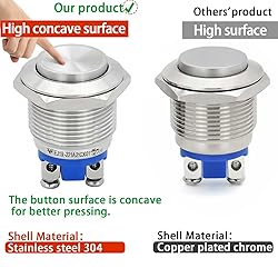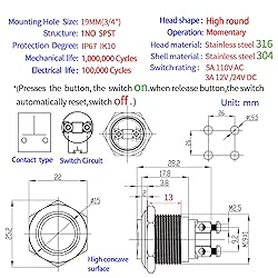 IP67 waterproof protection can be used in wet or dusty enviroment.Our Push Button Switch through UL certification and CE certification. Mounting Hole Size: 19mm ( 3/4inch ) hole, Swith Rating: 5Amp (110V-120V, 250V AC ), 3Amp (5V,6V,12V,24V,36V,48V DC) . Switch Contact: Normally Open, SPST. Ambient Temperature:-40℃ to + 70℃. Head Shape: High Round Concave , Concave is Easier to Press, Pressing feels comfortable. Shell color:Silver,Shell material:Stainless Steel 304. Head material:Stainless Steel 316. Total length: 30.1 mm (1.18''). Installation thread length: 13mm/0.51inch; Suitable for panel thickness<11mm/0.43inch. 19mm 3/4inch Momentary Push Button Switch: Push & Hold, ON; Release, OFF. The contacts are silver plated with gold, the screw pins are copper plated with silver, Mechanical Life: 1,000,000 Cycles. Package Include: 2 Pcs Push Button Switch. ★★ The powerful waterproof function of the button head IP67/IK10 can be applied to any outdoor environment, ships, and offshore equipment.