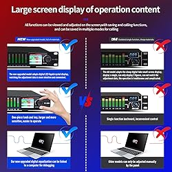 Rugged Portability: With a ultra-thin yet rugged chassis, our equalizer is perfect for on-the-go gigs or studio sessions. The sealed rotary controls resist dust, ensuring your equipment stays in top shape User-Friendly Interface: our equalizer with a large LED liquid crystal screen With a user-friendly interface and intuitive controls empowers you to effortlessly adjust the audio settings to suit your preferences. Fine-tune the bass, treble, and other frequencies with precision and ease Professional Grade Control: Dual-channel synchronized control of 31-band DSP-processed equalizer with LED spectrum indication per band and real-time 31-band frequency with 99% absolute accuracy. With cutting-edge noise gate noise reduction, use intuitive controls for precise audio production Versatile compatibility: Input and output interface support multiple types: TRS6.35/RCA Lotus/XLR XLR CANNON balanced interface,Connect to your equipment with ease. Whether it's a home studio setup or live performance equipment, our equalizers offer versatile compatibility. Easily integrate with microphones, musical instruments, home theater, pro audio and other sources PC control connection: The equalizer easily connects to your computer devices to enhance the audio experience. Bring exceptional clarity and depth to your music. Bypass graphic equalizer in the signal path with save and recall function to save multiple modes for recall
