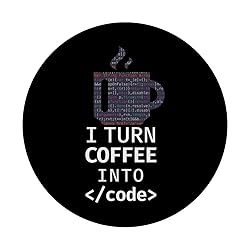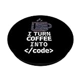 This Funny Programmer Coding Computer design reads i turn coffee into code. Perfect for a database administrator, software engineer or it professional who loves data & computer science and a database administrator, software engineer or it professional This Programmer Coding design features Javascript, Python and HTML or Java which is great for a network engineer, data nerd or computer engineer. Also a computer geek, data scientist, database admin or sysadmin working with php will like it Adhesive backing attaches the PopGrip to your case or device. Will not stick to silicone, leather, waterproof, or highly textured cases. Works best with smooth, hard, plastic cases. Not compatible with wireless charging Printed top is swappable with other compatible PopGrip models. Just press flat, turn 90 degrees until you hear a click and remove to swap.