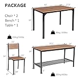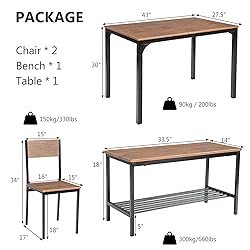 Dining Table Set for 4: Includes a spacious table, 2 high-back chairs & 2-person bench, this modern dining table set allows 4 persons to have a small get-together for chatting & eating together. Ergonomic design and large sitting seats ensure a comfortable sitting experience. Space-Saving Design Improves Utilization: Two armless chairs and the bench can be tucked under the table without taking up space. Also, the extra rack under the bench meets the needs for sitting & storing. All in all, this table set is suitable for limited living space. Durable Material & Sturdy Construction: Made of wear-resistant MDF and reinforced steel, this industrial dining set ensures great durability and sturdiness. Thanks to the heavy-duty metal frame, the high load capacity of the table, chair, and bench is 200 lbs, 330 lbs, and 660 lbs. Quick Set-Up & Easy Maintenance: With all parts given in the package, you can assemble the table and chair set easily by following detailed instructions. The smooth bottom feet will protect the floor from accidentally scratching. Since it has a waterproof tabletop, daily cleaning is a breeze with a damp towel. Wide Application in Various Occasions: Modern and stylish design makes this 4 pieces dining table set easily blend anywhere you want in your home or other places. Besides, this industrial kitchen set can be also used as a working desk or functional dresser, meeting all your daily needs.