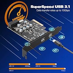 - The Super Speed usb 3.1 pcie card with dual Type-C ports provides convenient access to upgrade desktop computers or servers to support Type-C-enabled devices through the available x4 or larger PCI-Express slots. With a data transfer rate of up to 10Gbps, you can transfer videos, music, photo,and data files between USB C enabled devices and computers at extremely fast speeds. Feature: 1. Reversible USB-C/Type-C connector design (two-way insertion) allows you to connect easily Cable in any direction. 2. Supports simultaneous operation of multiple USB 3.1 USB 3.0/2.0/1.1 devices. 3.The 19-pin header can be used for the USB 3.0 port. USB Type E is used for the USB C port. 4. Compatible with PCI Express 3.0, 2.0, 1.0 standards. 5. Support Window XP/7/8/10, Mac 10.8.2 or above. Package : 1*PCIe USB 3.1 card 1*low-profile bracket 1* CD drive 2* screws