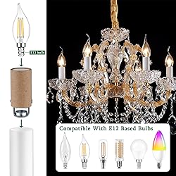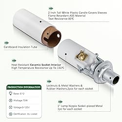 Ceramic Body.The bulb light E-12 sockets are ceramic.It has higher heat resistant rate up to 200deg,work with both LED and incandescent candelabra bulbs Complete Candelabra Bulb Light Holder Kits come with candelabra sockets with standard threaded pipe fixture,cardboard insulator covers and white plastic candle cover sleeves.Perfect solution for your chandelier socket project UL Listed.Quality components are applied to every part of the structure,sturdy,fire-proof and have longer lifespan Application- Great replacemet for fixing broken socket fixture on chandelier,rebuilt a chandelier,fix window Christmas Electric Candles,restore old candelabra,re-wire an old sconce light etc Electric Rating up to 125V/75W.Bottom socket threaded 1/8IP which fit standard 3/8" lamp pipe or nipple.The white sleeve cover is 2" long,and the external diameter is @ 7/8"(2.2cm), internal diameter is @ 13/16"(2.06cm).