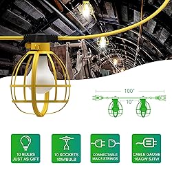 【Specification】 - 100FT, 10 Bulbs Included, 100 Watts, 10500 Lumen, 6000K Cool Daylight, Input 100-277 Volts AC, IP65 Waterproof, 16 Gauge Wire. 【Linkable Design & Wide Application】 - Our light is linkable, seamlessly connect up to 8 sets(80 bulbs), ideal for attics, garages, unfinished construction and jobsites where temporary lighting is needed for a wide area. 【Easy Installation】 - 100-foot extension cord with 10 medium base sockets, our construction lights can be installed at any place you want to hang. 【Waterproof and Commercial Grade】 - IP65 waterproof rating means this light can meet the needs of indoor and outdoor use. We uphold the highest standards for all our products by testing each product for optimal performance and safety, just buy with confidence. 【Lediary's Quatily】 - Our lights have a lifespan of 50000H. Any questions, please let us know, we will give you a satisfied reply.