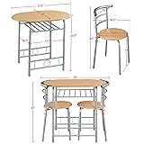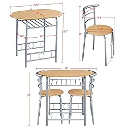Extra Storage Rack: Fitted with a convenient rack under the tabletop, this breakfast table provides additional storage space for wine bottles, napkins and other essentials, or you can remove the shelf for extra leg room. The timeless color scheme and small dimensions make this set ideal for the kitchen, balcony, bedroom, apartment, dorm room, office, temporary activity & party, etc Modern Look: This 3-piece dining set features classic curved silhouettes for a casual and inviting look. The steel slat frame has a stylish restaurant style, which reflects your unique taste. The wood-like grain adds a natural accent and balances the coolness of the metal Supportive & Firm: This kitchen table set includes 2 chairs with a mid-height backrest and round wooden seat. A curved slat backrest flawlessly wraps your back and gives you strong body support. You can also add seat cushions to achieve a softer sitting experience Designed for Small Spaces: Measuring 31.5’’ L x 21’’ W, the oval tabletop is large enough for 1-2 people to dine, read or have a close chat cozily. The chairs flawlessly fit the curving edges of the table, allowing you to entirely tuck them away when not in use to free up extra space for you. The space-saving design makes this set the ideal accent for compact spaces Sturdy & Durable: Made of premium steel tubes and CARB P2-compliant MDF boards, this sturdy dining table set is ideal for daily use and will last for years to come. The water-resistant tabletop provides an ideal place to enjoy your morning coffee or an intimate dinner for two. The table can hold up to 198lb, and the chair can support 300lb