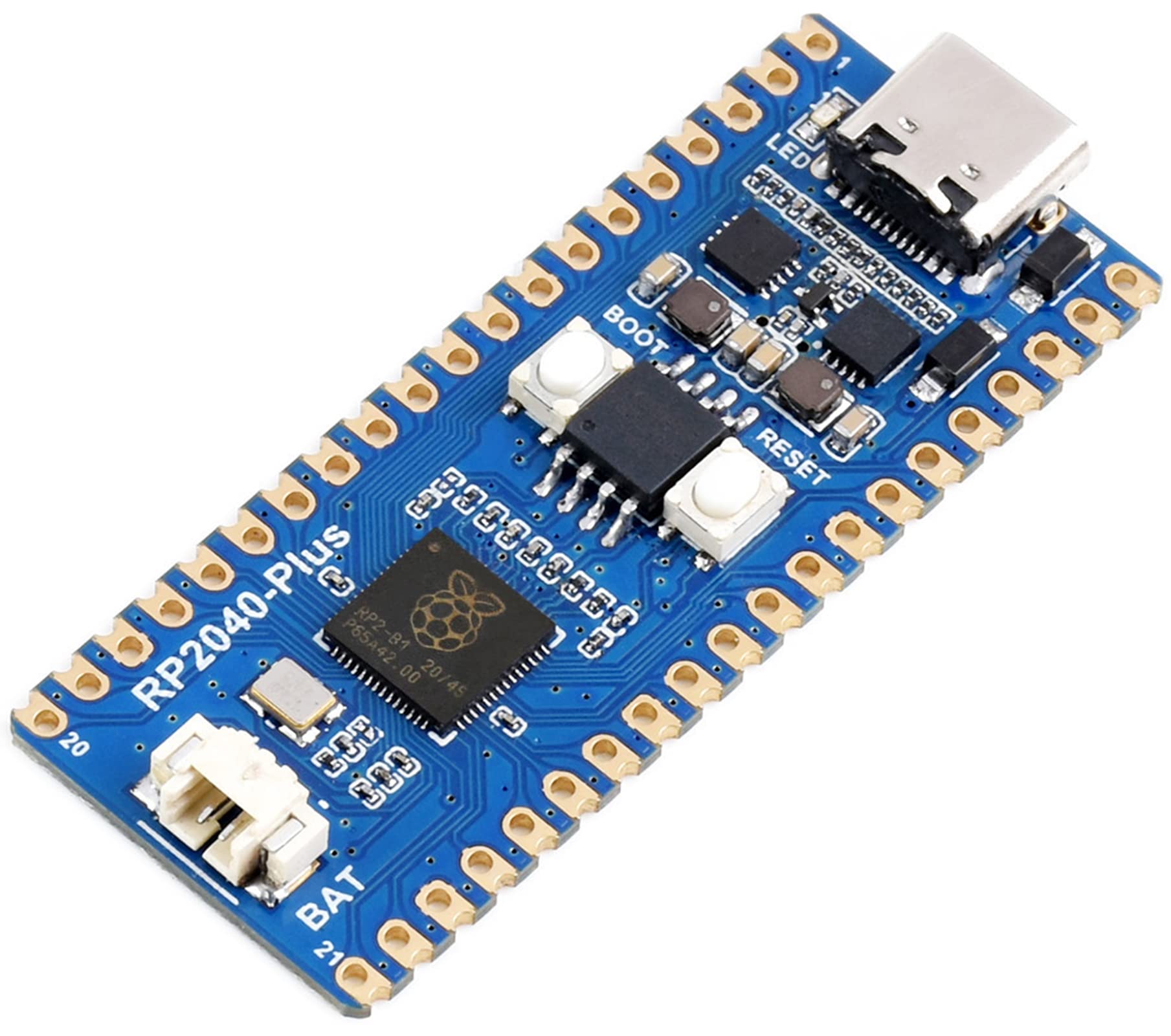 Overview Need more Flash for Raspberry Pi Pico? Dislike the outdated Micro USB connector? All these problems are solved by our RP2040-Plus now. As same as Raspberry Pi Pico, it incorporates the RP2040 microcontroller, with dual-core Arm Cortex M0+ processor running up to 133 MHz, and 26x multi-function GPIO pins. What's different, it features onboard 4MB Flash, USB-C connector, recharge header, and higher current DC-DC chip. And it is RP2040-Plus Board with Pre-Soldered Pinheader. Key Features RP2040 microcontroller chip designed by Raspberry Pi in the United Kingdom Dual-core Arm Cortex M0+ processor, flexible clock running up to 133 MHz 264KB of SRAM, and 4MB of onboard Flash memory USB-C connector, keeps it up to date, easier to use Lithium battery recharge/discharge header, suitable for mobile devices Onboard DC-DC chip TPS63000, high-efficiency DC-DC buck-boost chip, 1.8A current switch The castellated module allows soldering directly to carrier boards USB 1.1 with device and host support Low-power sleep and dormant modes Drag-and-drop programming using mass storage over USB 26 × multi-function GPIO pins 2 × SPI, 2 × I2C, 2 × UART, 3 × 12-bit ADC, 16 × controllable PWM channels Accurate clock and timer on-chip Temperature sensor Accelerated floating-point libraries on-chip 8 × Programmable I/O (PIO) state machines for custom peripheral support Support C/C++,MicroPython: Comprehensive SDK, development resources, tutorials to help you easily get started Compatible with most of the Raspberry Pi Pico add-on modules Development Resources/User Manual:bit.ly/WaveshareRP2040PlusBoard Package Content RP2040-Plus with pre-soldered header x1