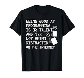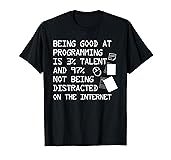 Are you a computer lover and enthusiast? Grab this Being Good At Programming Is 3% Talent And 97% Not Being Distracted On Internet art for men, women, boys, girls, youth teens. Cute IT gift idea for dad, mom, husband, and wife who are programmers. Cool novelty present for him and her on Birthdays and Christmas. Father and mother can give this to their kids and toddlers who are computer techies, geeks and nerds. Best for software engineering, web developer, tech-savvy, computer and science professor. Lightweight, Classic fit, Double-needle sleeve and bottom hem