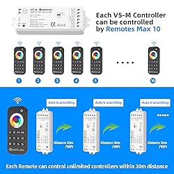 【Universal 5 channel led strip controller 12v~24v】: rgbw controller with 2.4G wireless RF Remote control, supports to control RGBCCT RGB WW CW RGBW LED strip Lights 12v/24v. You can easily control rgbw led strip without connecting to Wifi/Bluetooth/zigbee hub 【Simple and convenient rgbw controller remote control】: Sensitive color adjustment touch wheel+button design, 12v/24v rgbww led strip can be turned on/off without limiting the direction through 2.4G RF signal, set multiple RGB color mixing, CCT WW CW white light color, Can be brightened or dimmed 【Group control rgbw controller with remote】: RGBW LED strip controllers within a distance of 30m/98ft can automatically transmit wireless signals. Each RF remote control can control up to 10 RGBW LED controllers at the same time 【Compatible with 12v~24v RGB WW LED Strip light】led controller rgbw's DC power socket is 5.5mm*2.1mm, compatible with 12volt or 24vdc power supply. You need to prepare additional power supply dc and RGBW/RGBWW LED Strip 24v/12v 【Easy to use】No complicated operation: no need wifi, bluetooth, ZigBee hub,and no need to download APP. Please pair before use rgbw controller remote: Short press the pairing key, and then short press the on/off key on the RF remote control Suitable for FCOB COB LED strip and RGB/RGBW/RGBCCT led strip ASIN:B09MYQH2G4,B0C4S8DY9T,B0C4SKT7CV,B0C4S3GY4D. Also please prepare AAA battery for led remote
