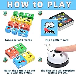 FACE CHANGING CUBE GAME: The Blocks toy is suitable for 1 to 4 players. It is an excellent interactive game toy that is adored by children aged 3 and above. In this game, players select a card and construct blocks based on the patterns shown. Parents and older siblings can easily grasp the rules and teach the game within minutes, enabling gameplay to commence as soon as the box is opened. PUZZLE GAME FOR GAME NIGHT: An intriguing face-changing cube puzzle game, a beloved classic board game. It provides enjoyable solo play for preschoolers and is equally engaging for adults. Both children and adults can have a blast with this quick and easy game, suitable for all ages and genders. Perfect for parties and game nights, it guarantees endless fun! EDUCATIONAL PUZZLE-BUILDING CUBE GAME: This matching game is designed to assist children in developing and enhancing their memory skills, comprehension skills, cognitive abilities, visual perceptual skills, and attention to detail, all while improving spatial memory. Varbertos strongly believes that children should have constructive and engaging alternatives to screen time, and this game serves as a perfect solution. EXPRESSION PUZZLE BUILDING BLOCKS: Engage in a head-to-head puzzle game that merges the strategy of Puzzle Building Cubes with exhilarating face-to-face gameplay. How quickly can you align your colored Cubes to match the card pattern? The first player to succeed seizes the card, triggering a new race to match. Tension mounts as you strive to outpace and outwit your opponents in this brilliant game of perception. Ignite your cognitive skills and embark on an immersive matching adventure! WONDERFUL GIFT FOR KIDS: Kids will be delighted to engage with the expression blocks, neatly stored in an attractive box. It's an ideal choice for birthdays, Christmas, holidays, and any special occasion. This challenging and intelligent game will captivate your children. They can enjoy quality game time with parents and friends, creating joyful memories together.