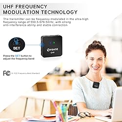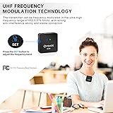 - Compact Wireless Microphone System: Easy to carry. There is a clip on the back of the receiver and transmitter, which can be directly installed on the camera hot shoe or on the mobile phone. A single product weighs only 30g, and there is also no pressure on the collar.Easy To Use: After the transmitter and receiver are turned on, they are automatically connected for about 3 seconds. The receiver can use a 3.5mm TRS or TRRS cable (included in the package) to connect to mobile phones, notebooks, SLR cameras and other devices to start recording. If the device does not have a 3.5mm interface, please use a standard adapter for transfer (not included in the package).UHF Signal Anti-interference Technology: C-01 defaults to channel B, with blue light and 30 UHF adjustable frequency bands. The frequency band range is 550.5-579.5mhz. In case of interference or noise, simply press the set key of the transmitter to switch the frequency band, and the receiver will automatically adjust the frequency without other operations.Built In Microphone: built in high sensitive capacitor microphone, omnidirectional pickup, stable signal. The package contains blowout prevention wool ball, which can be additionally installed on the built-in microphone of the transmitter. There is a connection distance of 50 meters (164 feet) without other interferences.Wide Applications: The wireless lapel microphone can be used for live broadcasting or recording programs on third-party platforms such as Tiktok and Youtube. It can be used as a microphone for recording various vlog and ASMR videos, as well as podcasting or online teaching.