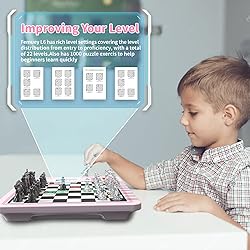 BOARD GAMES FOR KIDS : Electronic chess set to improve all of your logic skills and brush up for your next competition, Kids or Adults can Play Against. L6 has three playing modes: Training, Match and Human. ELECTRONIC CHESS SET : 9 kinds of LED indicators, including 6 that represent the color of chess pieces and 3 that warn of chess move hazards. Cool-colored LED lights help beginners quickly understand chess and learn the game.Femuey L6 has 1000 puzzle exercises, we can select ‘Puzzle’ from the main menu, and press the ‘OK’ button and the e-paper display as Figure 11. COMPUTER GAMES: With built-in AI, Play against the computer or a friend; L6 has rich level settings covering the level distribution from entry to proficiency. Chess computer playing strength of over 2300 ELO (International tournament standard), which corresponds to the level of the Grandmaster and is suitable for most chess players. Note: The level setting applies to both training mode and match mode. Chess Set Board Game:Chess is best when you are challenged but still have a fair chance to win. It is most satisfying when you have a suitable opponent of similar strength or just above your level. This is exactly what L6 offers. It has a unique system to analyze your play during the game and it uses that information to challenge you at your own personal level. In addition, L6 plays in a very human way for your perfect playing experience. Chess Set Board Game:Chess is best when you are challenged but still have a fair chance to win. It is most satisfying when you have a suitable opponent of similar strength or just above your level. This is exactly what L6 offers. It has a unique system to analyze your play during the game and it uses that information to challenge you at your own personal level. In addition, L6 plays in a very human way for your perfect playing experience.