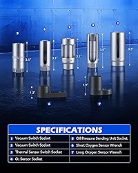 Comprehensive Kit: Orion Motor Tech's 7pc. oxygen sensor socket set includes 5 sockets in 22 mm, 27 mm, & 29 mm sizes with 3/8 and 1/2 in. drive, plus 2 sensor wrenches, providing everything you need for precise oxygen sensor servicing Access Tight Spots: The U-shaped groove keeps wiring intact while allowing fast and safe removal without cutting wires. Our 12-point socket makes it easy to align and access sensors in cramped spaces, while the 6-point sockets provide maximum torque Easy to Use: Snag your favorite ratchet and the right socket in a flash! Each socket in our oxygen sensor removal kit fits standard 3/8" or 1/2" drive ratchets, with laser-etched sizes for quick and easy identification Built to Last: Made from durable Cr-V steel with a chrome finish, our O2 sensor removers resist corrosion and wear. The chrome molybdenum steel sensor wrenches, with a black oxide finish, offer extra protection against impact and moisture Works for Most Vehicle Types: Perfect for removing and installing oxygen sensors, oil pressure units, diesel injectors, vacuum switches, and thermal sensor switches, our O2 sensor socket removal kit is compatible with Audi, BMW, Mercedes, Volkswagen, and more