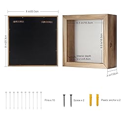 Memory Box - Protect and share your most precious moments and memorabilia. You can arrange a personalized collage with photos, cards, military memorabilia, pet memorabilia, concert tickets, medals, etc. Perfect gift. Hinged Door - The front display door makes it easy to place or exchange items inside. The magnetic door is very convenient to open and close, and prevents the items inside from falling out. Decorative Frame - The solid wooden vintage look complements any decoration, and it has two hooks on the back for easy wall mounting. High-Quality Materials - The 8''x 8''x 3'' ( Interior Size: 6.5 x 6.5 x 2 inch ) deep depth shadow box comes with a solid, durable wood frame, woven fabric interior with 10 stick pins, magnetic door with a transparent shatterproof glass window, and two metal sawtooth hanging hooks on its back. Rest Assured Purchase - If at any time our product does not meet your expectations, simply contact us to solve the problem.