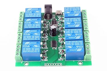 NOYITO 8-Channel Micro USB Relay Module is equipped with a stable USB to serial port chip and a microcontroller. It can use the serial port debugging software to send serial commands on the computer to control the opening and closing of the 4-channel relay. Onboard high performance microcontroller chip, CH340 USB control chip. Relay ON/OFF status query command: 0xFF. 【IMPORTANT TIPS】Power supply voltage: DC5V. Support USB power supply/external power supply switching. (External power supply interface: connect to the power supply 5V, because the output current of the USB port is limited, it is recommended to use an external power supply when using more than 2 relays) On-board 5V relay, 10A/250VAC, 10A/30VDC relay, long relay life, can work 100,000 times continuously. Module with overcurrent protection and relay diode freewheel protection.With power LED indicator and relay status LED.