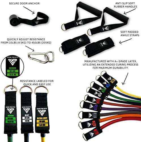 HomeProGym Stackable Resistance Band Set - with Up to 450LBS of Resistance, Band Bar, Premium Handles, Heavy Duty Door Anchor, Padded Ankle Straps, Digital Workout Guide