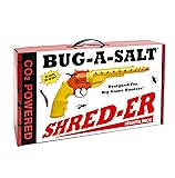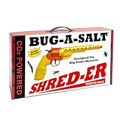 The Bug-A-Salt Shred-Er, launched in 2021, is an American built CO2 powered, salt blaster designed for big game hunters. No batteries required. Non-toxic, patented salt (ordinary table salt) cartridges annihilate hard and soft bodied insects including giant roaches, yellow jackets, wasps, murder hornets, lantern flies, Carpenter Bees, and scorpions. This patented product is 10 times more powerful than the Bug-A-Salt 3.0 and manufactured for Adults Only! Read your manual thoroughly, follow all safety instructions, and absolutely do not modify your Shred-Er. Starter kit includes: 1 Bug-A-Salt Shred-Er, 2 Packets of Bug-A-Salt Shred-Er Patented Ammo (Qty. 24), and 1 packet of Bug-A-Salt CO2 canisters (Qty. 5). 240 shots = 240 dead roaches! Limited 2-year warranty with proof of purchase.