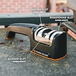 - The Work Sharp Pull Through Kitchen Sharpener is a fast, easy, and effective way to sharpen your kitchen knives. The Diamond Wheels quickly sharpen the edge, while the Ceramic Wheels hone the edge back to a factory level of sharpness. The additional Diamond Plate restores a sharp edge to your scissors. The comfortable rubber grip and base provide a safe and comfortable sharpening experience. The compact design fits easily in your kitchen drawer, with your camping supplies, or with your BBQ kit.