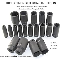 Superior Performance: Whether you drive them with an impact wrench or by hand, these premium chrome vanadium sockets deliver superior performance. The impact socket set features a 6-point, high-torque design that contacts and grips the stronger flat sides of the nut or bolt head, not the weaker corners. Rugged Construction: The Impact socket pieces are constructed of heavy-duty chrome vanadium steel, which is oilproof and rustproof, to withstand extreme levels of torque changes against fasteners. 19 Sockets Included: This effort-saving 1/2'' drive impact socket set comes with 19 impact drive sockets: 3/8'', 7/16'', 1/2'', 9/16'', 5/8'', 11/16'', 3/4'', 13/16'', 7/8'', 15 / 16'', 1'', 1-1 / 16'', 1-1 / 8'', 1-3 / 16'', 1-1 / 4'', 1-5 / 16'', 1-3 / 8'', 1 -7/16'', 1-1 / 2''. Sturdy Storage Case: The set comes with a customized heavy-duty case for portability. Designated slots in the case keep every piece in place. Sizes are also stamped beside each slot for easy identification and organized storage. Wide Application: This high torque socket set is perfect for removing and installing wheel lug nuts, particularly suitable for most trucks, RVs, and other heavy-duty vehicles.
