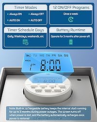 [Multiple Setting & 5 Modes] Up to 20 ON/OFF schedules for 7-day repeat cycles or a single-day setting to meet your needs; pool controller has options for Always ON/ OFF, AUTO ON/OFF, and Daylight Saving Time (DST) modes; turn it ON/OFF or change modes using the MODE button; multiple modes & day settings to save on your electric bill [Heavy Duty 40 AMP & Versatile] With 40 Amp 2HP 120/240/277 VAC, the pool pump timer control up to 2 units at once; designed for outdoor/indoor high-power appliances like pool pumps, heaters, filters, and other motor-driven equipment; giving peace of mind and convenience for managing your pool and outdoor equipment [Built-in Battery Keeps Settings] Backup battery included with 3 months available; No need to repeat settings for 7-day pool timer switch in case of power failure; hassle-free use; No more worry about losing your previous timing and settings [Weather-resistant & Durable] Waterproof resin PC housing with flame-retardant insulation resists UV & high temperatures; 2 water outlet holes prevent water from entering the junction box; pool pump timer outdoor operate from -40℉ to 140℉ for long-lasting performance; No need to turn it off or store it in bad weather [Easy Installation] Removable timer module makes simple wiring and hassle-free; heavy-duty pool timer wiring apertures in 2 sizes (1/2'' and 3/4'') to suit your needs; included wiring caps to simplify the installation process and ensure a smooth setup