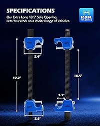 Ideal for Most Vehicles: Orion Motor Tech's spring compressor tool set with a 10.5" maximum jaw opening, is ideal for repairing damaged parts and maintaining suspension of the MacPherson struts and springs found in most small and medium-sized cars Easy Operation: The main shafts and precision threading on our compressor provide smooth and precise movement. Compatible with your manual or power tool's 1/2" square drive or 13/16" hex sockets, it makes transferring old springs to new struts effortless Secure Compression: The wide end pieces on these two automotive strut spring compressor tools quickly and easily lock onto your springs, maintaining a secure hold as you work; the built-in locking pins provide additional security and precision Built to Last: Our pair of coil spring compressor tools features high durability and corrosion resistance, even under punishing use, thanks to their heat-treated 40 Cr steel construction, black oxide finish on the threaded rods, and galvanized end pieces Compact & Portable: This shock spring compressor tool set comes with a blue blow-molded case, keeping parts organized and easy to carry, store, and access, ensuring you are always prepared for your next repair job