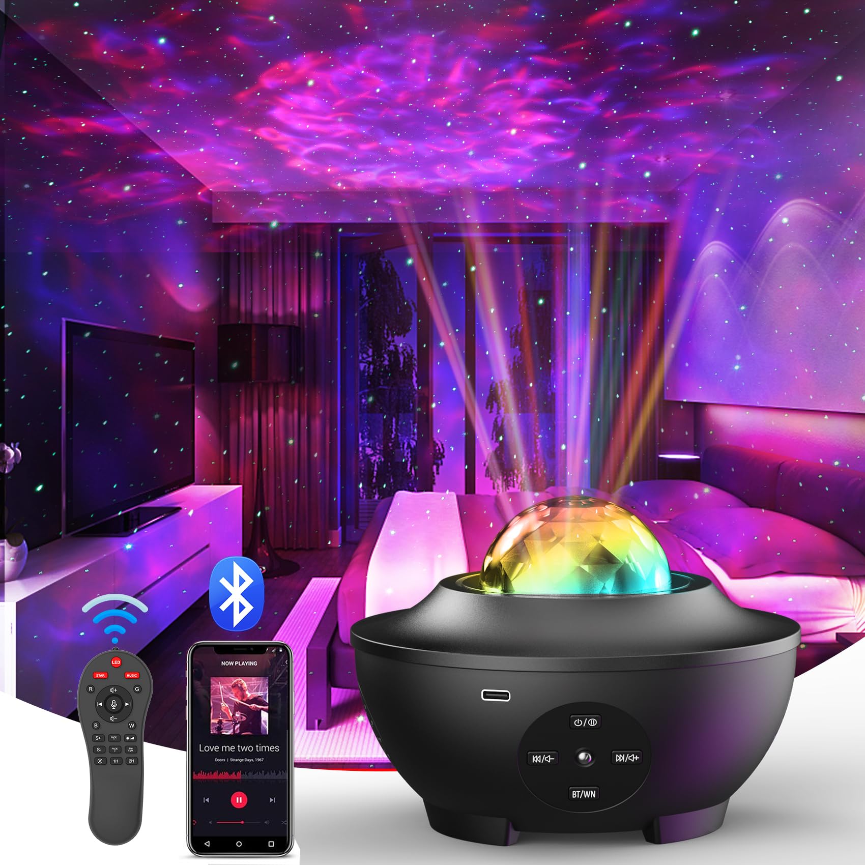 - 💮【8 Soothing White Noise & Bluetooth Speaker】-- There are 8 white noise sounds on this night light projector, which are a varied selection of relaxing sounds, including ocean wave, summer night, thunderstorm, white noise, brook and lullabies. This galaxy projector also built-in 5.0 speaker, you can connect your devices via Bluetooth to play music, and it also allow the lights projection sync with the music beat, creating a disco party light effect or the soft ambience.