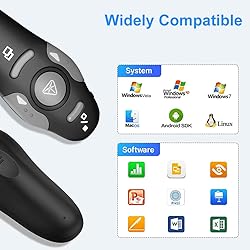 - Presentation Clicker 1.The wireless presentation clicker for powerpoint presentations not only gives you the ability to easily change the slides but with the laser pointer built in. You can give an explanation to all audiences or students that you're teaching. 2.The buttons of PowerPoint clicker have a great feeling and are responsive, no delays. 3.Remote powerpoint clicker with laser pointer has a big clear laser beam. Light Range: 328FT/100M. 4.Cats and dogs love chasing laser light spot. Wireless presenter remote with laser pointer has bright pointing red light dot. 5.The remote presentation pointers has All in One design, which is drop-proof and wear-resistant. 6.The slide clicker with laser pointer for presentations is a perfect gift for your friends, coworker, family or teacher must haves. 7.Power point remote clicker with laser has sleek profile and light, so easy to keep in pockets or in clothes. 8.Presentation remote is easy to use even for a beginner. Computer Clicker for Presentations Product Specifications Technology: Radio Frequency Frequency: 2.4GHz Control distance: 100FT Laser Class IIIA(<5mW) Laser Light Distance: >200m Light Wavelength: 650nm Working Voltage: 3.7V Weight: 20g Presentation Clicker with Laser Pointer Warm Tips (1) Do not forget to turn off your PPT clicker with laser pointer after use! (2) Do not forget to pull out the USB receiver of Presentation Clicker after use! (3) Power point remote clicker 1 YEAR QUALITY SUPPORT.