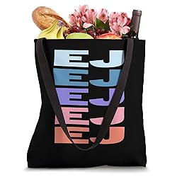 This fun text design says "EJ" in a super modern font and color scheme. 16” x 16” bag with two 14” long and 1” wide black cotton webbing strap handles. Made of a lightweight, spun polyester canvas-like fabric. All seams and stress points are double-stitched for durability, and the reinforced bottom flattens to fit more items and hold larger objects. Spot clean/dry clean only.