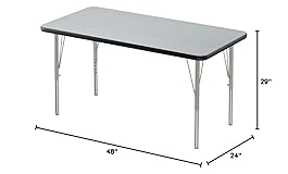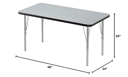 SIZE: Table Size is 24"x48" rectangle shaped Legs easily adjust from 19" to 29" in height in 1" increments, perfect for many different ages, with Speed-Wrench for fast, easy adjustments TOP: Thermal Fused Laminate Top resists scratches, dents, paint, markers, crayons, and food and juice stains DURABLE: Designed for the heaviest use in demanding environments such and schools and churches, crayon and even permanent marker can be removed without damage Made in USA, Custom Built-to-Order since 1969 with superior features such as backer sheets to prevent warping, the strongest leg mounting in the industry, and free speed wrench for fast and easy height adjustments