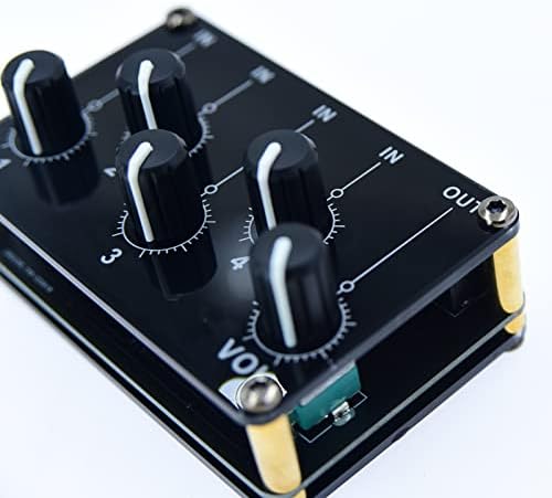 multiple input mix 4 way 1/8" inch in 1 out stereo passive mixer headphone sound audio speaker splitter selector switcher 3.5mm udio switch box aux loop volume knob control 3.5 mm mixing Sharing