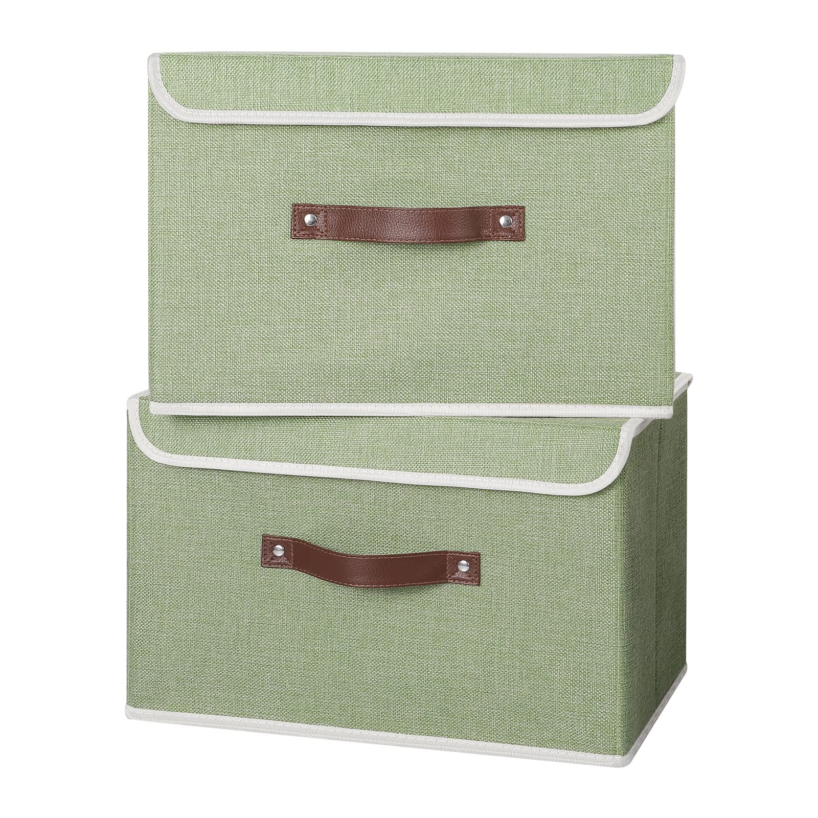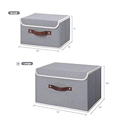 Includes 1 pack large lidded storage bin, measuring 15" long, 10" wide and 10" high. Crafted from high-quality cotton linen fabric and thick PP plastic board, this storage bin is washable, and durable enough for long-term use. Top lid with Velcro closure is easy to open and close, and can prevent dust from the stored contents like clothes, shoes, blankets, DVDs, books, photo albums, scarves and more. Front faux sturdy leather handle and 2 side fabric handles for easy pick up/down or movement. Stackable and collapsible design for space-saving organization and storage. The classic design will satisfy all kinds of your home decoration. They can also be pretty and practical gift for friends and family!